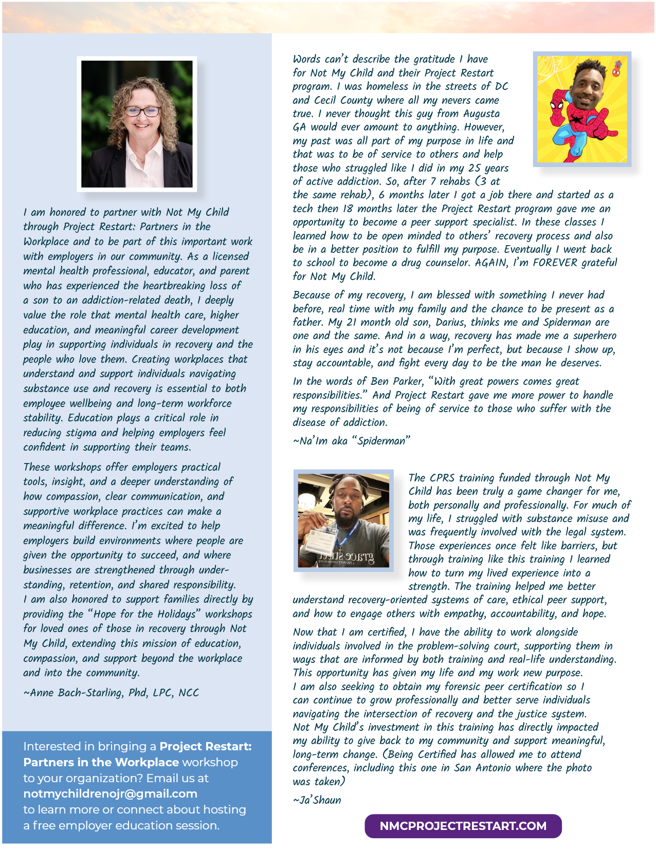 Since losing his own son, Anthony, to addiction in May 2017, Not My Child founder, Tony Reno, has spoken out about the dangers and realities of the opioid epidemic, provided support to those recovering from addiction, and given assistance to families who have lost a loved one. Thanks to their donation, Camp supplies and registration fees will be covered for future families dealing with the grief associated with losing a loved one to an overdose.